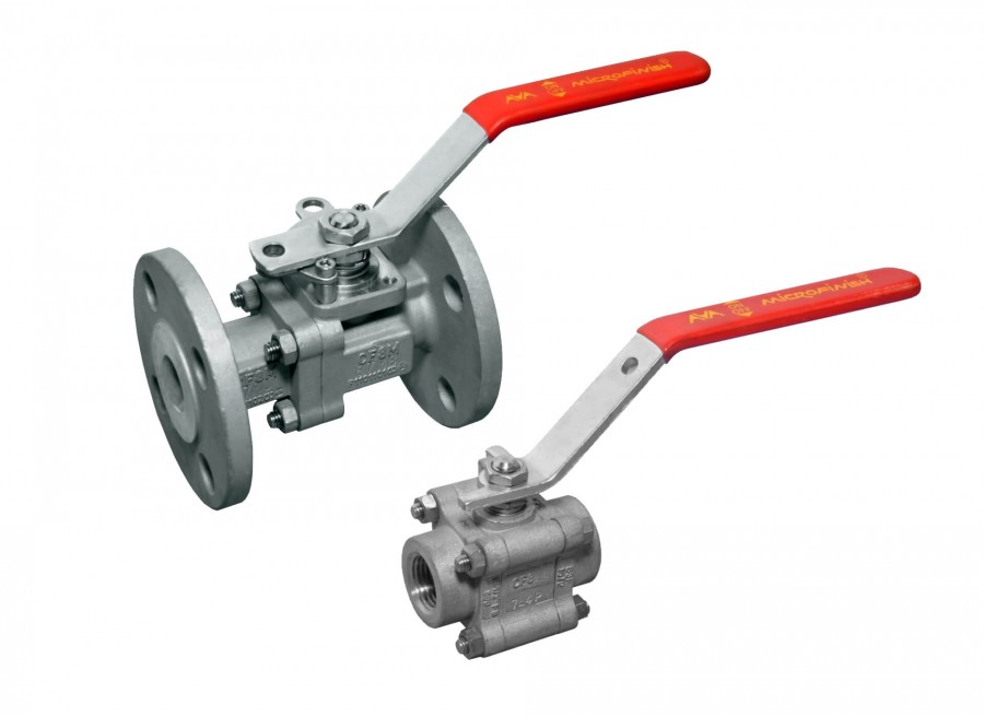 Microfinish floating ball valves are available in a flanged type one piece side entry design; a two piece mainly ASME flange type design, and three piece with a variety of end connections such as threaded, socket weld, butt-weld, and extended butt-weld ends for in-line welding.